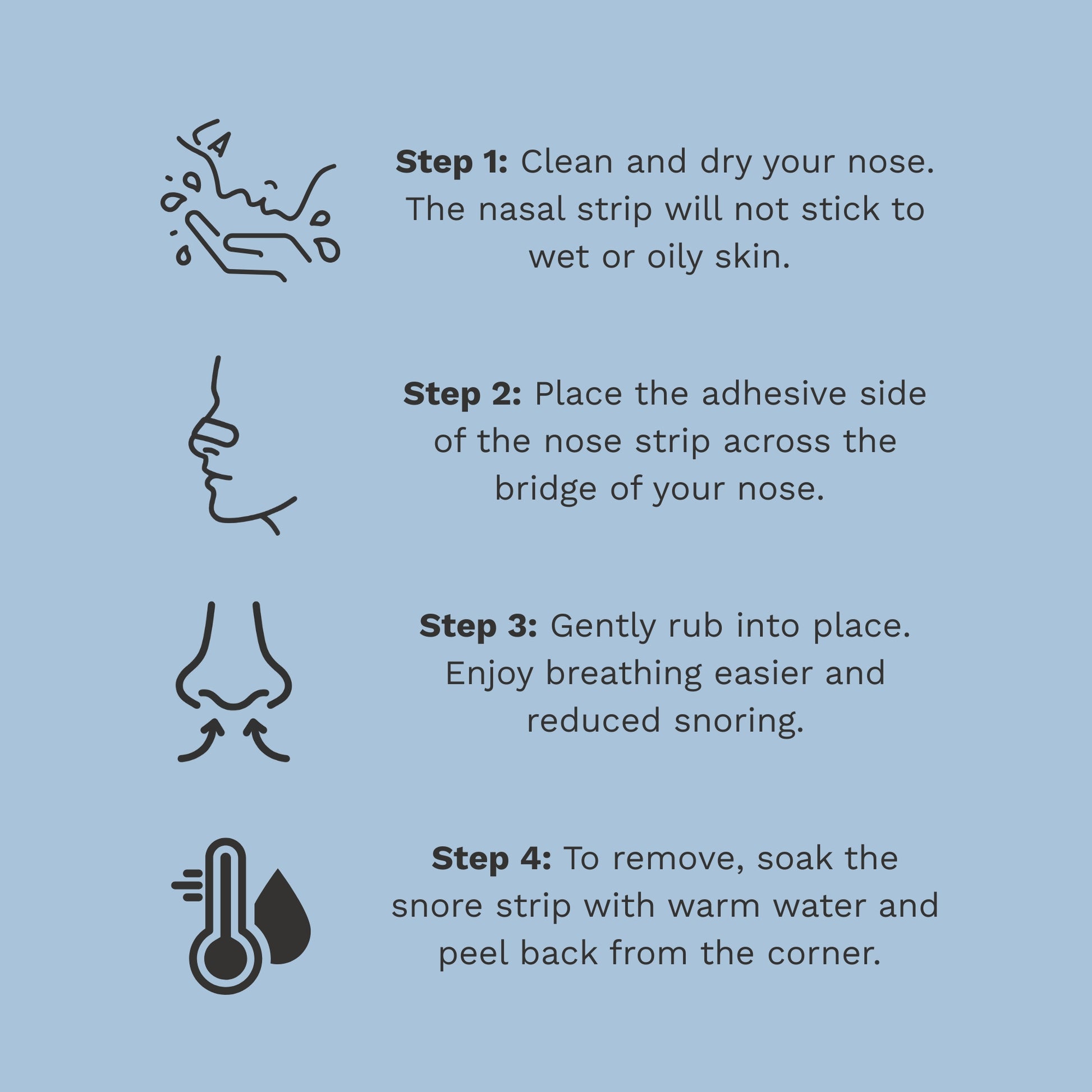 ★ APPLY WATER FOR EASY REMOVAL - As our nasal strips have been specifically developed to most effectively adhere to your skin, we recommend soaking the plaster with warm water to loosen the adhesive before removal.